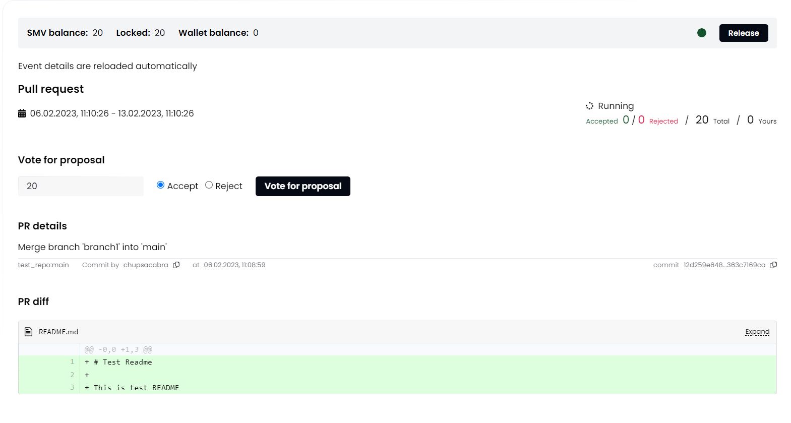 If the branch you are working on does not require a vote to commit changes, they will be committed immediately. Otherwise, a DAO vote will be initiated.