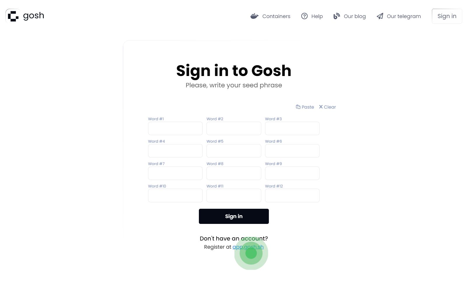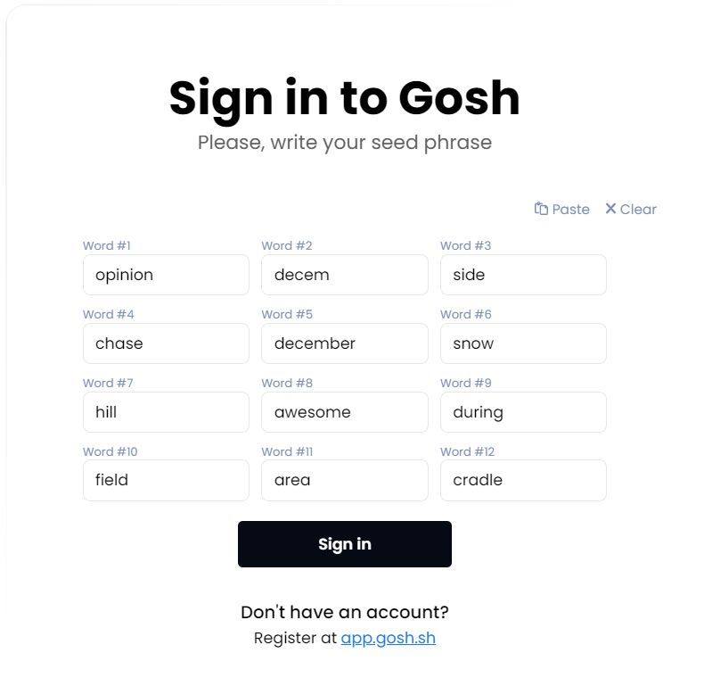Your seed phrase will be used to log into GOSH.