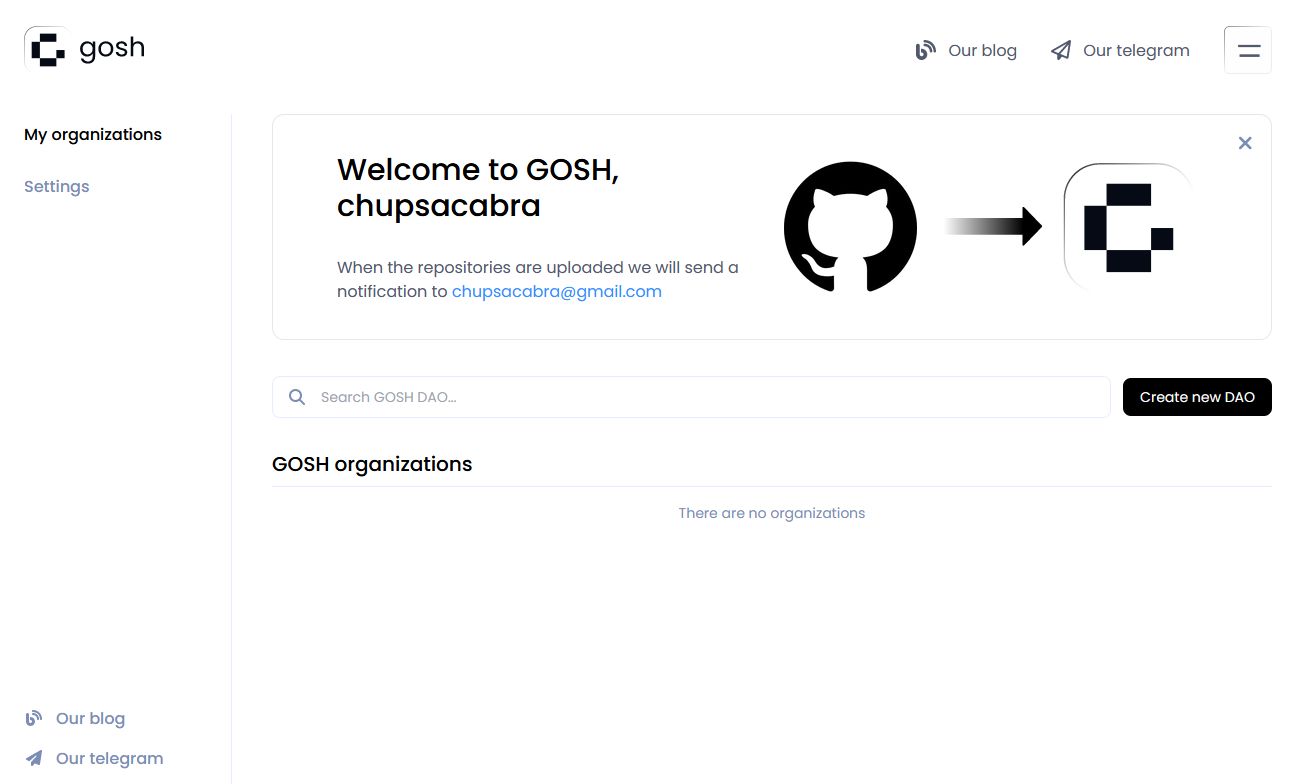 The special GOSH DAO Bot will help with registration in GOSH. It will deploy your DAO and upload your selected repositories to GOSH.