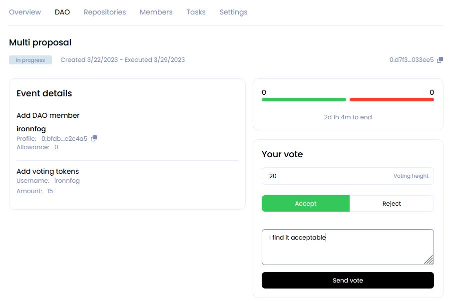 At the same time, a multi proposal will be created to add DAO members and provide voting tokens.