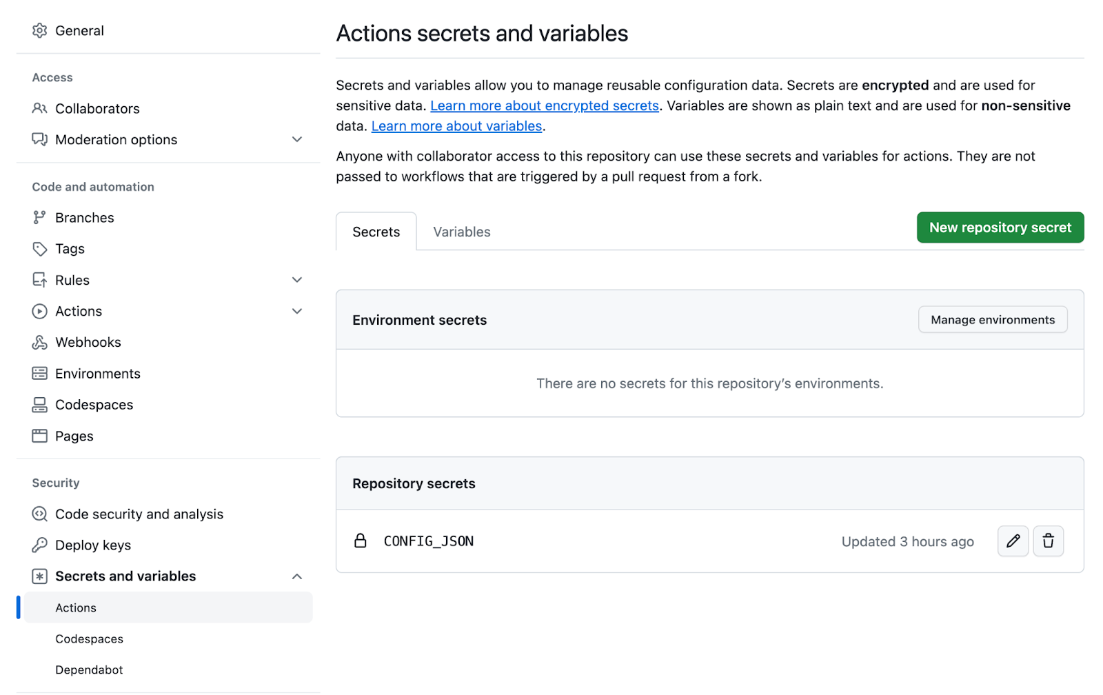 - Go to repository settings in the Secrets and variables in GitHub, and press New repository secret, and add credentials