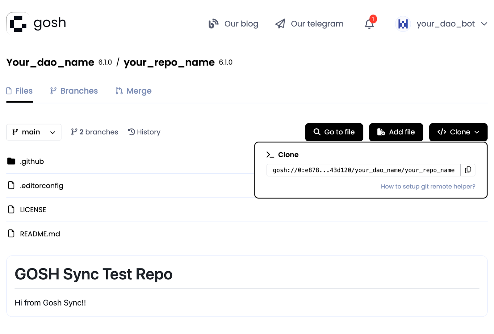 After this is done, all of the changes pushed to GitHub will be seen on GOSH (except the branches’ names). Starting from this first commit onwards, every change to your GitHub repository will be mirrored to GOSH.