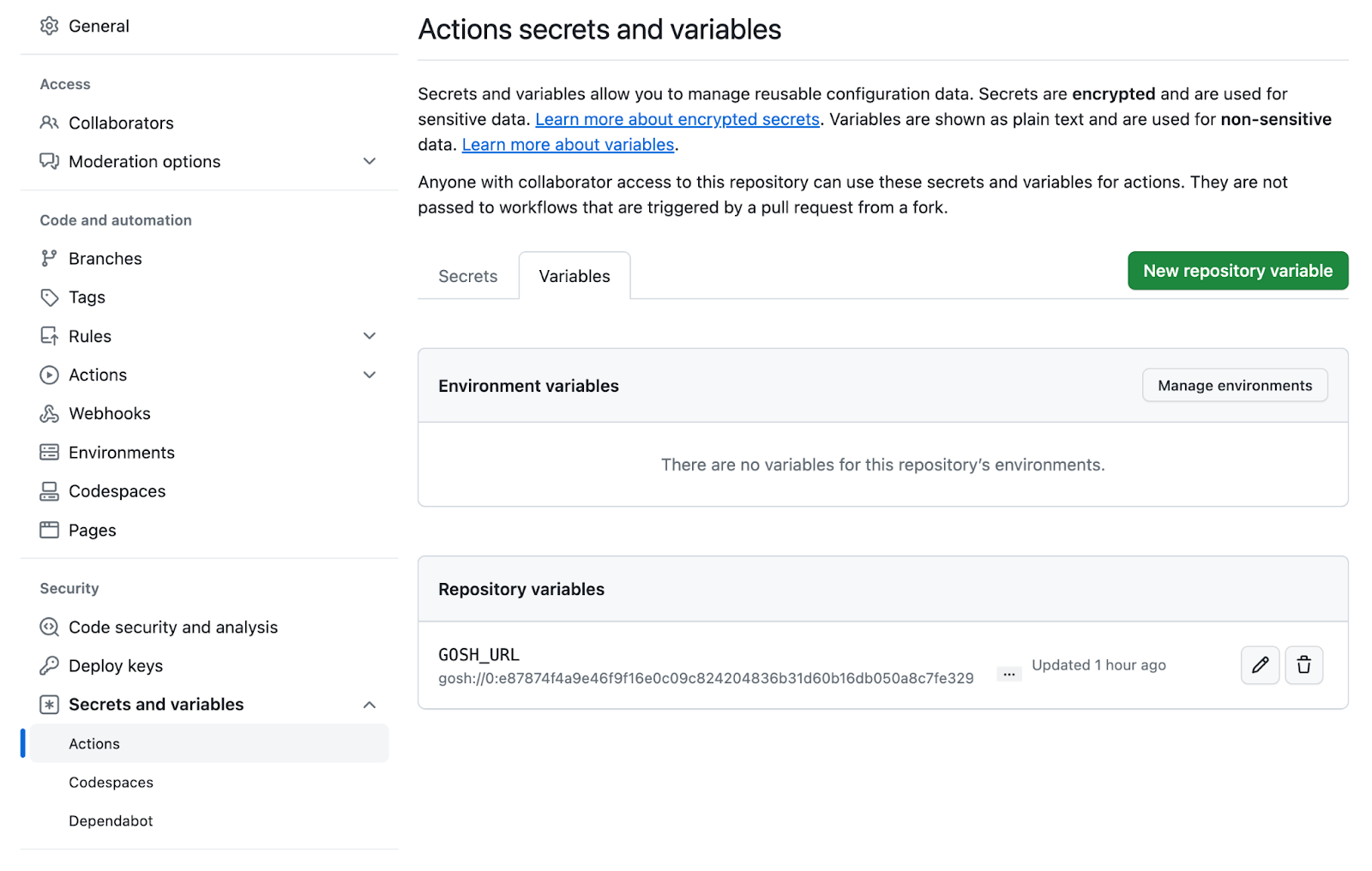 Click on New repository variable: